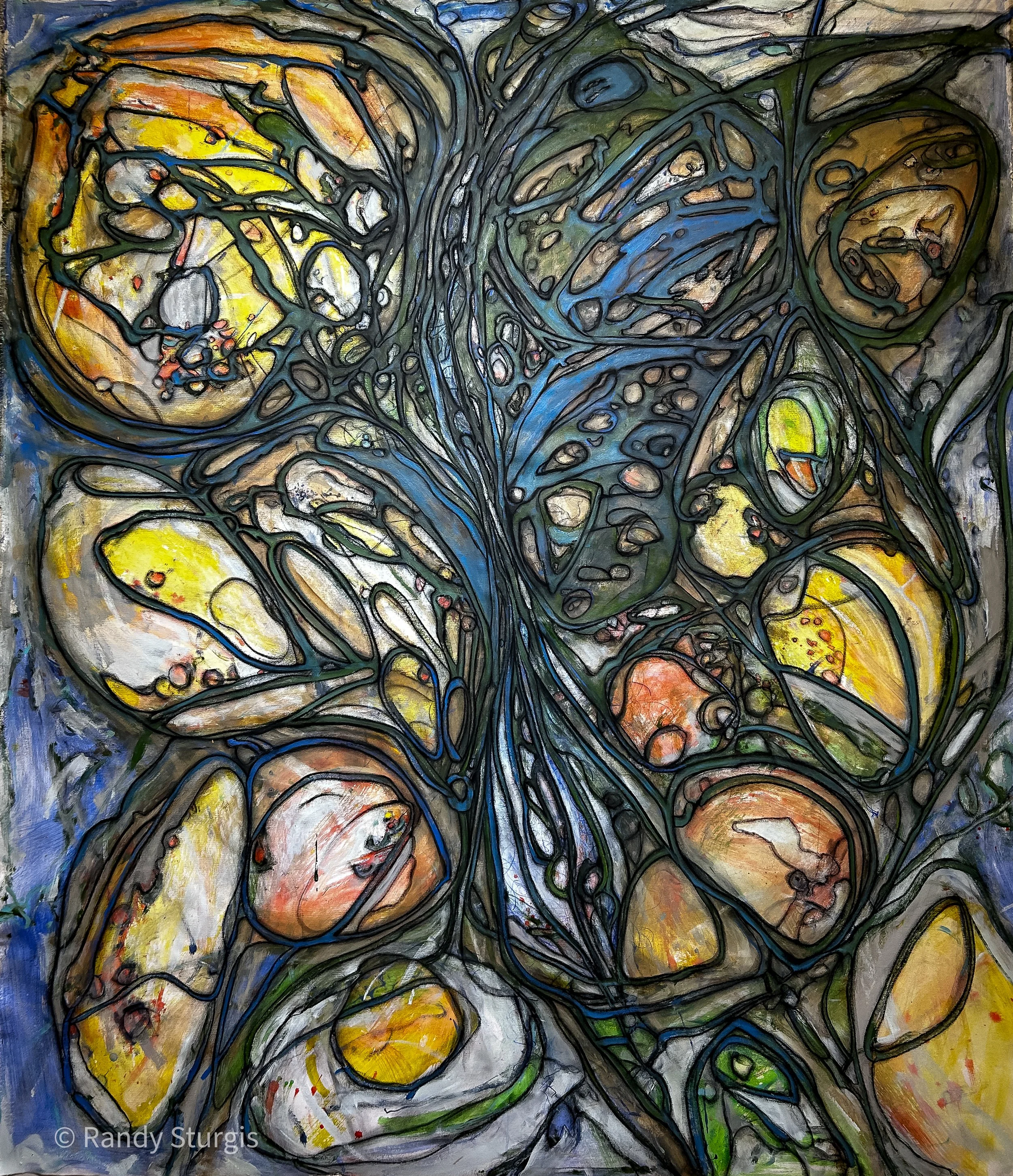 Recent paintings are larger scale in format, flat “environments”, non-objective... mostly in subject matter, positive in nature. I love working in the studio with the materials and subjects.